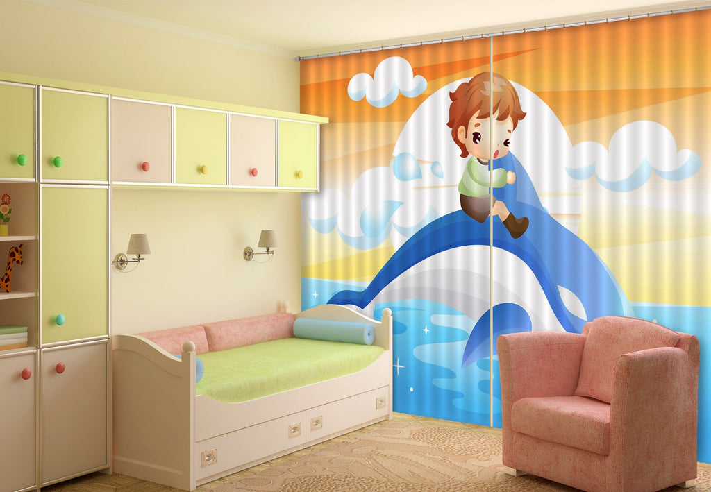 3D Lovely Dolphin And Kid 693 Curtains Drapes