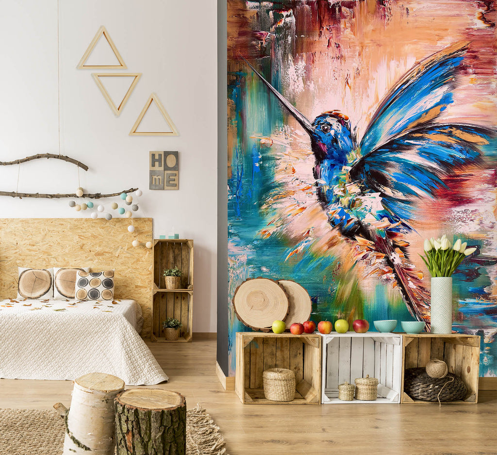 This painted blue bird mural is a charming and whimsical addition to any room. The playful design and bright colors make it perfect for adding a touch of fun and joy to your home.