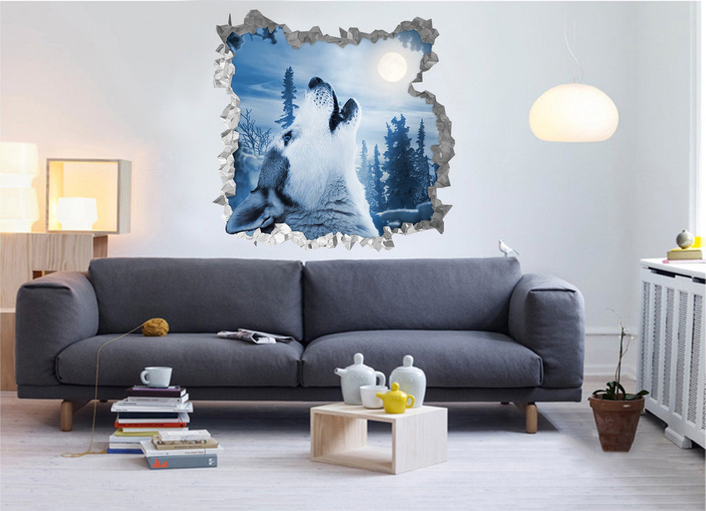3D Bright Moon Wolf 232 Broken Wall Murals