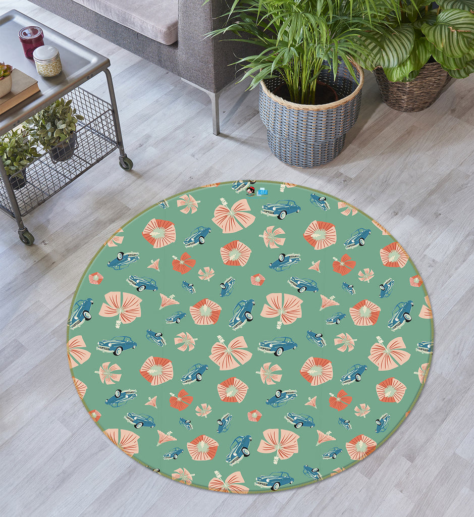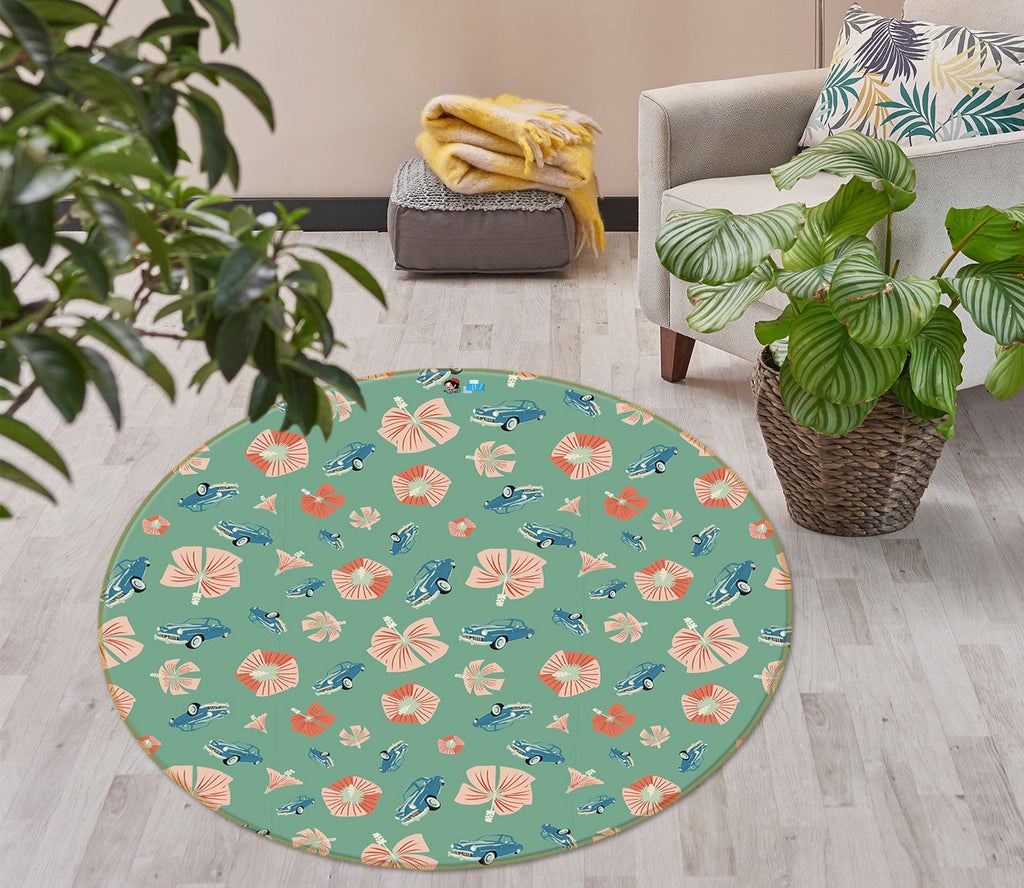 3D Blue Car Pink Flowers 9893 Kasumi Loffler Rug Round Non Slip Rug Mat