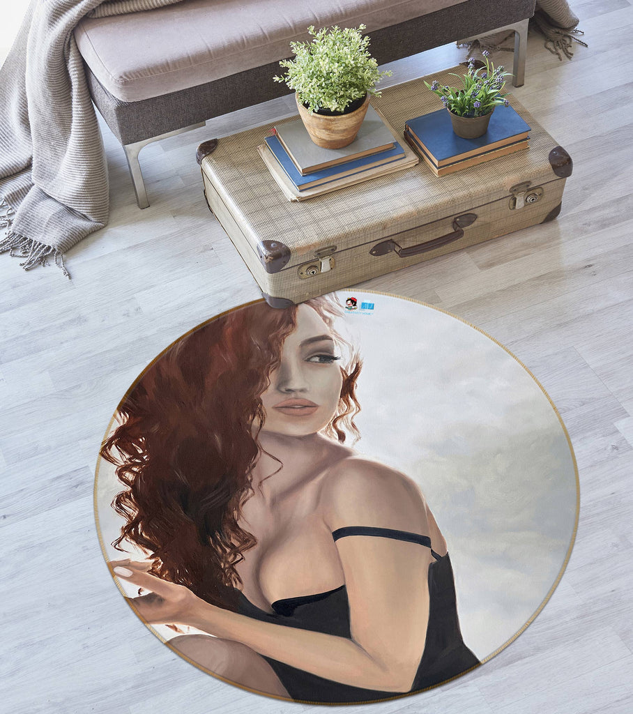 3D Woman Red Curly Hair Black Dress 9732 Marina Zotova Rug Round Non Slip Rug Mat