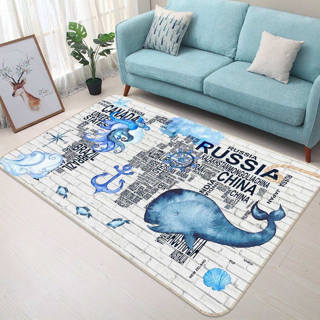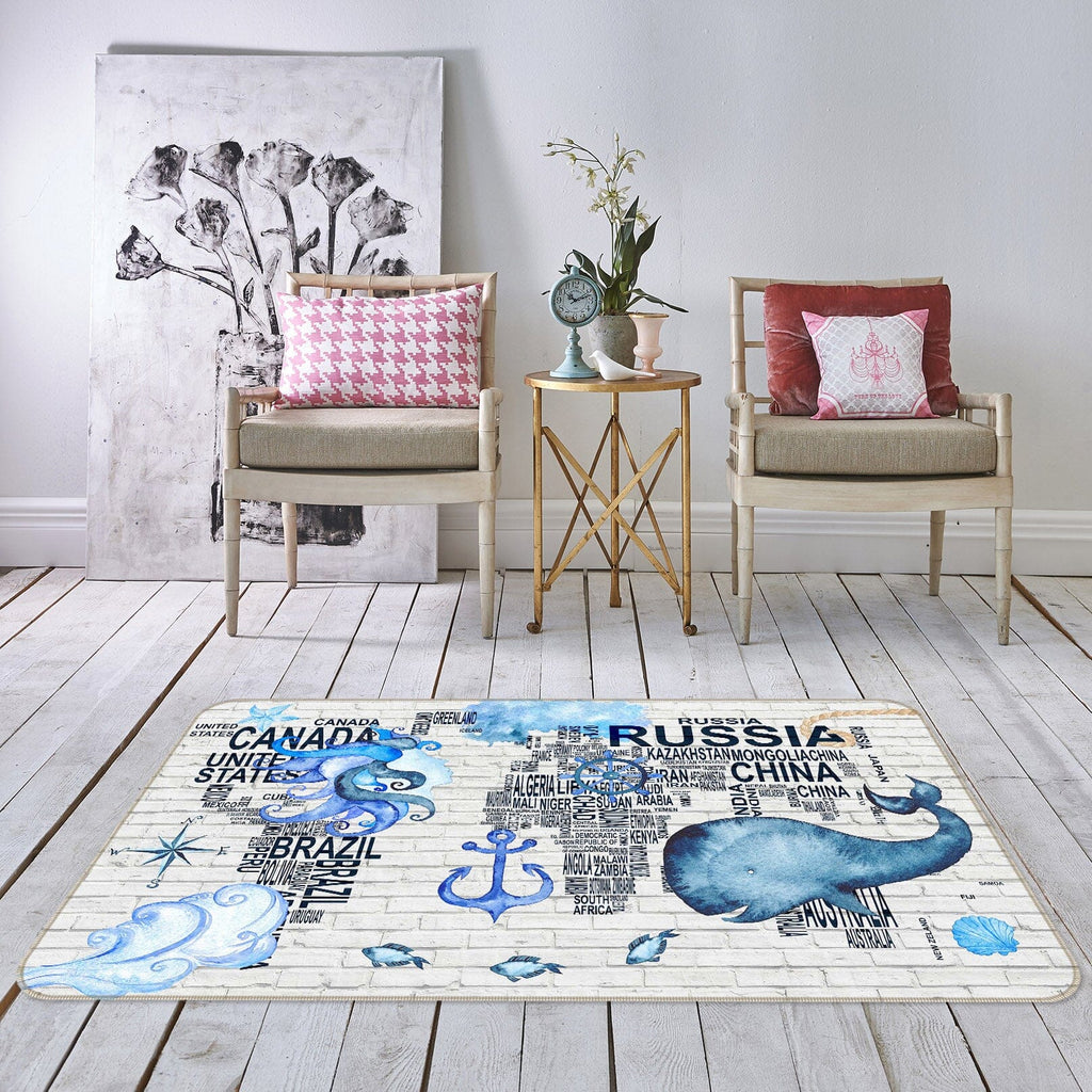 3D Blue Whale 206 World Map Non Slip Rug Mat
