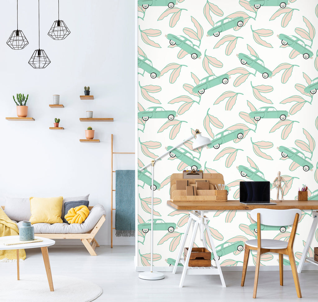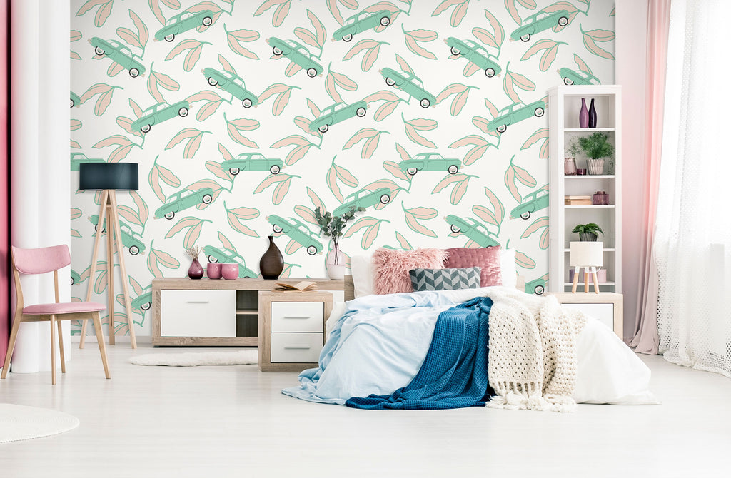 3D Green Car Leaves Pattern 98131 Kasumi Loffler Wall Mural Wall Murals Sinsin